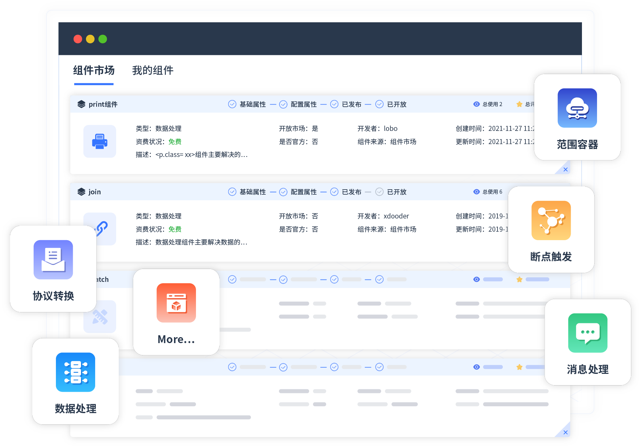 针对集成场景,南宫28登录入口提供组件市场,例如协议转换、消息处理、文件操作等。除平台提供的组件外,客户可以自定义所需组件。