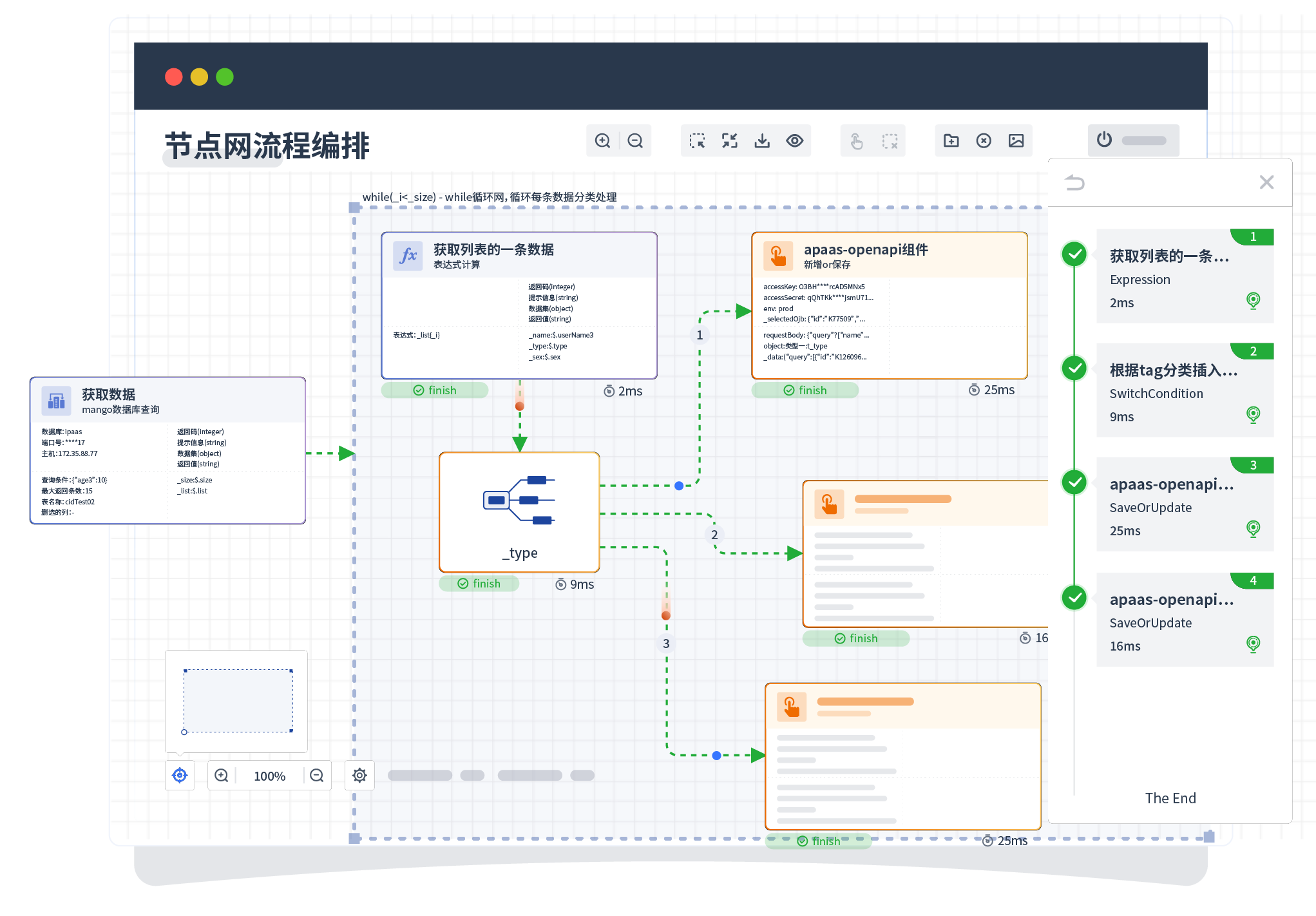 针对集成场景,组件定义后支持进行流程编制,不同于传统代码方式,通过图形化展示,支持在线调试、日志查看和运行回放。